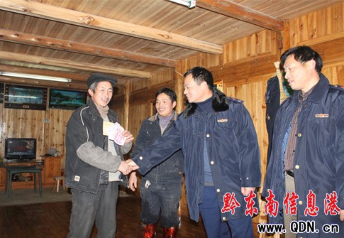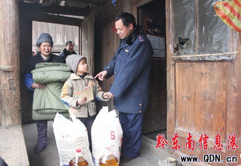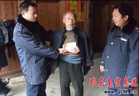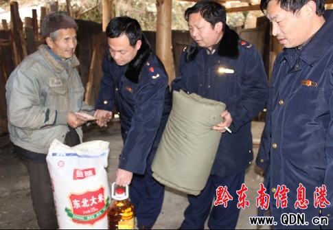 1月26日,雷山縣工商局黨組組織該局干部深入到幫扶村——西江鎮(zhèn)烏堯村開展“三個建設(shè)年”和“四幫四促”活動中,了解到該村“五保戶”和困難黨員的生活情況,當天為該村五名“五保”老人和兩名孤兒每人送去大米50斤、菜油10斤、棉被1床及現(xiàn)金100元;為四名困難黨員每人送去現(xiàn)金200元,讓他們度過一個歡樂祥和的新春佳節(jié)。同時,還為該村“兩委”贈送辦公經(jīng)費1000元。此次活動送去物資和現(xiàn)金共計5083元。深受該村“五保”老人、孤兒和困難黨員及村民感激不盡。