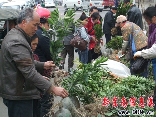 近年來,雷山縣先后投入2000多萬元發(fā)展果品業(yè),全縣果樹種植面積達31104畝。2010年,全縣掛果面積29277畝,產(chǎn)量達4143噸,產(chǎn)值956萬元。農(nóng)民來自果品業(yè)的純收入超過550萬元。當(dāng)?shù)剞r(nóng)民嘗到甜頭,紛紛利用田邊地角和陡坡耕地退耕栽種果樹。圖為3月2日該縣各族農(nóng)民在縣城苗木市場購買果苗的情景。(張希才 攝影報道)