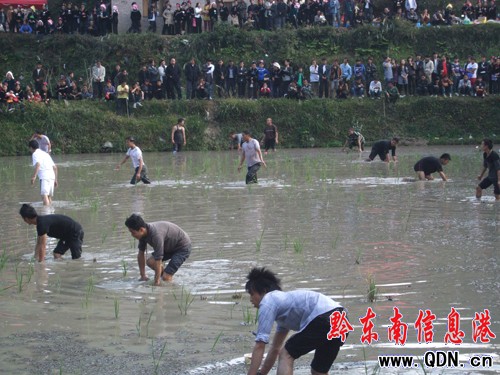 為使雷山縣苗年和十三年一輪回的苗族“鼓藏節”活動豐富多彩,該縣投入近千元購買大鯉魚投放水田,于11月17日,由“2011中國·雷山苗年暨鼓藏節”組委會主辦,西江鎮黃里村承辦的“捉魚比賽”在黃里村壩子田公路旁舉行。來自各地青年男女150多名參加下田捉魚比賽。在捉魚比賽中,有不少選手捉得5-10條不等,有的捉一條都不得,在上萬觀眾拍手鼓掌不休,使節日添了更濃的樂趣。(張希才)