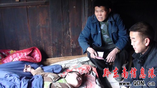 15歲的余軍是大塘鄉(xiāng)咱刀村一個先天性的腦癱患兒,父親去世,母親改嫁后,一直跟著爺爺奶奶生活,如今爺爺奶奶已經(jīng)70多歲了,看著15年來一直癱瘓在床的孫子,爺爺余學文從縣殘聯(lián)理事長韋福俊的手中接過500元的慰問金,久久握在手里,激動得不知說什么好。丹江鎮(zhèn)腳猛村文國華雙下肢癱瘓,看到縣殘聯(lián)的領導多次上門關心自己,借助雙拐也要堅強的起來感謝。(全先疆)