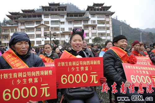 3月8日,雷山縣丹江鎮一名農村苗族婦女領到6000元計劃生育“少生快富”獎樂呵呵。當天雷山舉行計劃生育四項制度首發儀式既關愛女孩宣傳活動,來自農村帶頭落實計劃生育政策的30名代表領取獎金。
