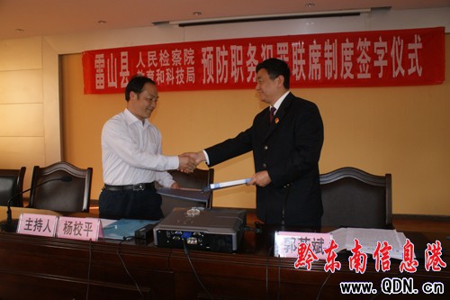 近日,雷山縣人民檢察院、雷山縣教育和科技局聯(lián)合召開預防職務犯罪工作聯(lián)席會。會上,宣讀了《關于成立雷山縣教育系統(tǒng)預防職務犯罪工作協(xié)調領導小組的通知》和《預防職務犯罪工作聯(lián)系制度》,并進行了預防職務犯罪工作聯(lián)系制度簽字儀式。