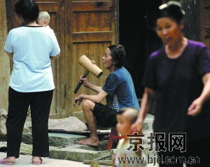 侗布是婦女們自種棉花,自紡、自織、自染而成的,以經(jīng)久耐用、柔軟舒適而久負盛名。浸染成青色或紫色的布,晾干后需用木槌反復(fù)捶打半個多月。