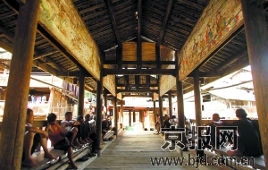 白天風(fēng)雨橋上坐滿了慵懶的侗族男人,得天獨厚的自然條件創(chuàng)造了獨特的生活習(xí)慣。長廊式的風(fēng)雨橋既可供人行走,又可擋風(fēng)避雨,還是人們休息和迎送賓客的場所。