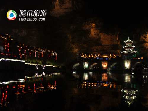 夜晚的鎮遠,被那些紅燈籠、霓虹燈點綴著,似乎在召喚著每個好奇的游客走近瞧瞧,里面將會發生一個又一個美麗的故事。夜晚坐著畫舫,靜靜的,慢慢的游走在舞陽河上,細細的品嘗著古城鎮遠這道精美的“宵夜”,不知不覺人在河上醉了,人在燈中迷失了,可謂是如夢如畫,但卻真實發生了。