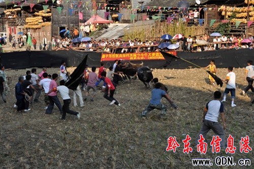 斗牛是端節必不可少的節目,當天下午,賓客們都放下手中的酒杯,紛紛來到現場,把斗牛場圍得滿滿的。14時許,斗牛比賽正式開始,來自周邊各村寨的一對對膘肥身健的水牛一一亮相,他們賽場上相互碰撞、相互斗角、相互追趕,互不相讓,場面動人心魄,十分激烈,精彩的表演贏得了觀眾們的陣陣掌聲和歡呼聲。場上的工作人員有的拉繩,有的勾牛鼻,圍著斗牛在場上不停地奔跑。