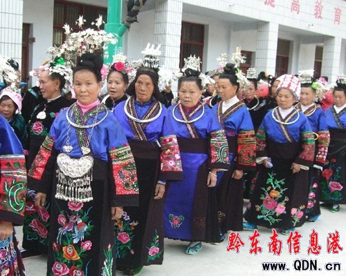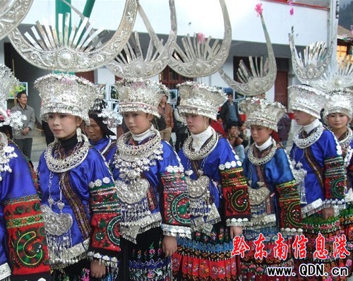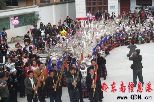 苗族同胞們在歡跳銅鼓蘆笙盛會的時候,由鼓藏頭家的女兒領舞,在吹跳蘆笙行列中,盛裝在前,便裝在后,盛裝行列中,頭戴銀冠并插銀角在前,只戴銀冠沒有銀角的在后,各色隊伍中,皆是高者在前,矮者在后,層次分明。