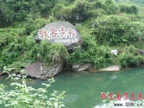 盛夏時(shí)節(jié),驅(qū)車來(lái)到309省道29900米處,隔河望去,對(duì)岸一巖石上“我要讀書(shū)”四顆大字非常扎眼。此標(biāo)語(yǔ)不僅為峽谷山美、水清石奇的河流增添了一道亮麗的風(fēng)景,還發(fā)揮了“兩基”迎“國(guó)檢”工作的宣傳作用。