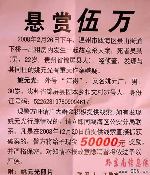 通過大量走訪和案件分析,警方初步認定姚元光有重大作案嫌疑。在8個多月來四處尋找姚元光并叫其親友敦促姚到警方自首無果的情況下,警方遂將姚元光列為網上通緝嫌犯。昨日(25日),警方在凱里向社會發出懸賞通告,吁請廣大群眾提供線索。如有發現姚元光行蹤者,請即與警方聯系;凡在12月30日前提供線索直接抓獲破案的,警方將給予現金50000元獎勵,并嚴格保密。