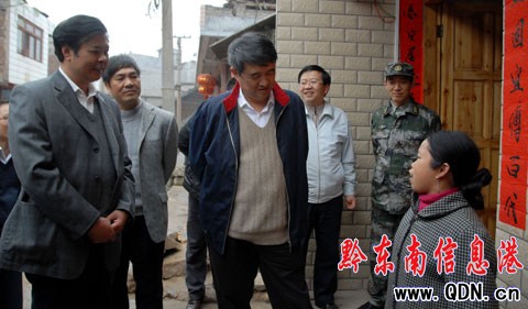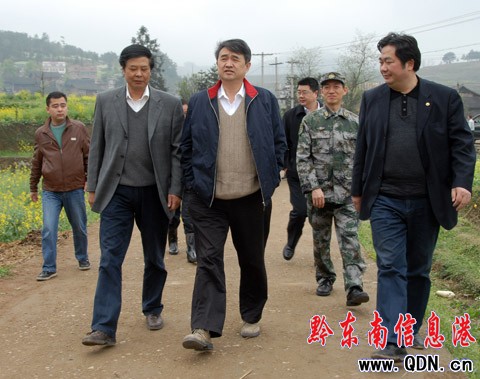 4月3日,州委書記廖少華(左三)在丹寨縣委書記古鵬(左一),丹寨縣委副書記、縣長龍先金(左二)的陪同下到丹寨縣居民區(qū)了解居民的生活用水情況。