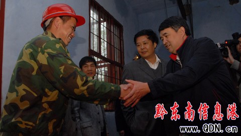 4月3日,州委書記廖少華在丹寨縣“引水入城”應急水源工程竣工儀式上與工程建設者親切握手