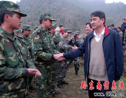 4月3日,州委書記廖少華在丹寨縣“引水入城”應急水源工程竣工儀式上與援建官兵親切握手