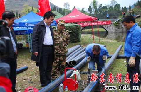 本港訊 (凱里市自來水公司辦公室) 自來水公司抗旱突擊隊自3月31日進駐丹寨縣“引水入城”工地以來,為早日改變丹寨縣城每三天只供5小時水的現狀,讓丹寨縣城居民早 日正常用上自來水。突擊隊員們在周鴻、龍洲倆位隊長的帶領下、克服施工地點不通路,所有安裝、焊接設備全靠肩挑人扛過田坎、下水溝等 困難,發揚不怕苦、不怕累、連續作戰的精神,餓了就扒幾口盒飯,困了就在工地上打個盹,汗水、雨水濕透了工作服,寒風刺骨全然不顧。 為確保所焊接管道能鋪設到預定地點,他們在3.5公里 的深山峽谷中來回穿梭,不知跌倒了多少跤、腳底破了多少水泡,但為了“供水生命線 ”,沒有一個人退出“戰場”。他們根據地形情況焊接不同長度的管道,最長的根管道焊接竟長達350米,重達10多噸,需200多名官兵同時運 送。就這樣,在與參戰官兵的共同努力下,經過60小時的連續作戰,丹寨縣“引水入城”3.5公里管道安裝工程于4月2日23時提前48小時完成。