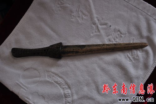 據(jù)天柱民間收藏家楊先生介紹,2003年,在清水江天柱段白市境內(nèi)野豬巖灘,夏季沿河的村民取砂淘金時(shí),一民工偶然所得,被湖南客商花100元賣走,楊先生幾經(jīng)周折以1800的高價(jià)買回,將其命名為“夜郎佩劍”,一直珍藏至今。