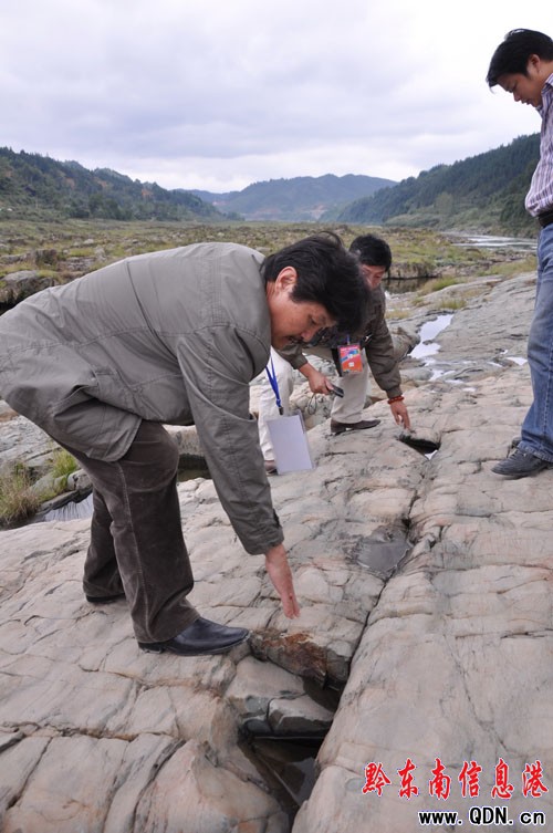 10月13日,何小龍、朱丹等 8名收藏家一行專程赴出水“天柱劍”的清水江白市境內(nèi)野豬巖灘實(shí)地踏察,清水江江面寬闊,水流湍急,岸邊巖石上發(fā)現(xiàn)有古人打鑿的拉纖的腳坑或絞盤的石坑,初步證明早期有人類活動(dòng)的足跡。