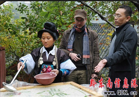調研組一行在丹寨縣晟世錦驛鄉村俱樂部、揚武鄉老冬村先后考察了丹寨縣石橋古法造紙工藝、苗族刺繡、苗族蠟染、苗族服飾工藝、銀飾制作和農村婦女就業幫扶培訓、民族手工藝品研發生產基地、民族貧困村寨等項目。考察中,丹寨縣縣長龍先金向客人介紹了丹寨縣的基本縣情和縣政府在扶持民族地區經濟、社會和文化發展過程中所發揮的作用。