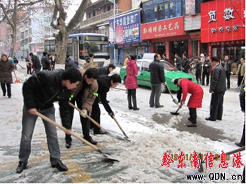 活動冰災(zāi)伊始,團州委下發(fā)了《關(guān)于發(fā)揮共青團突擊隊作用做好抗擊冰災(zāi)有關(guān)工作的緊急通知》,號召全州各級團組織、廣大團員青年、志愿者,發(fā)揚不畏艱險、持續(xù)作戰(zhàn)的作風,沖鋒在前、戰(zhàn)斗在前的精神,積極行動起來,踴躍的參與到“抗冰災(zāi)·青春大出擊”行動中去。在遭受新一輪冰雪第一時間,全州各級團組織開展了“掃雪鏟冰”行動。自1月18日起,州、縣市直機關(guān)、企事業(yè)單位團員青年,五四紅旗團組織、青年文明號集體、青年突擊隊、志愿服務(wù)隊的近萬名團員青年志愿者先后走上城市的各條主干道以及高速公路和國道、集市、車站拿起鐵鍬和鐵鎬,動手清理路面上的冰雪,開展大規(guī)模的掃雪鏟冰行動。經(jīng)過幾天的奮戰(zhàn),全州城鎮(zhèn)主要干道路面的冰雪全部清除,高速公路、國道等路面的積雪也基本清除,全州公路交通基本恢復(fù)。