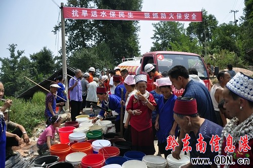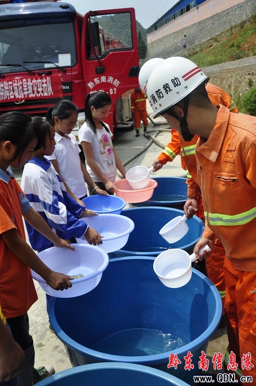 據了解,為了防止由于大面積缺水和重點城鎮缺水而引發其他社會問題,消防總隊制定了《全省消防部隊跨地區域抗旱送水預案》,將全省劃分成了黔中、黔東、黔北、黔西四個區,對不同等級的旱情實行有組織的跨區域送水行動。各地消防官兵心系百姓,冒著酷暑前往各縣市最缺水的地方送去甘露。