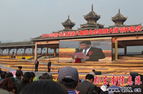 在笙歌飛揚(yáng),碩果飄香的日子里,11月28日上午9點(diǎn),2011年中國·從江第八屆原生態(tài)“侗族大歌節(jié)”開幕式在從江縣第一民族中學(xué)隆重舉行。省人大常委會原副主任、省苗學(xué)會會長楊光林出席開幕式并宣布2011年中國·從江第八屆原生態(tài)“侗族大歌節(jié)”開幕。