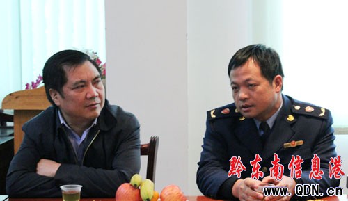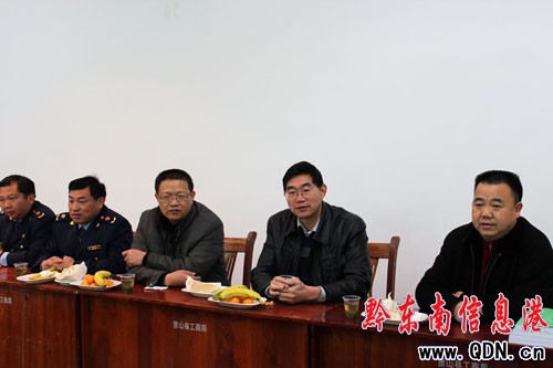 州工商局副局長李軍(右三)聽取該局2011年工作開展情況