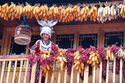 圖為一名苗族少女在晾曬辣椒。