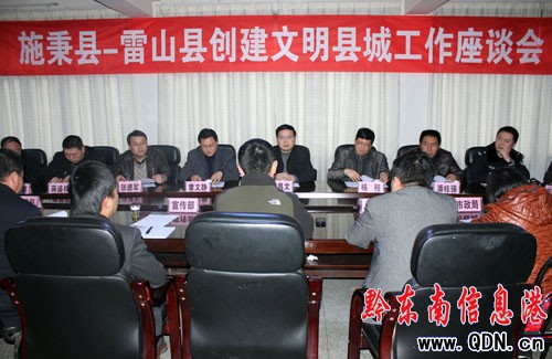 2月23日,施秉縣委常委、宣傳部長劉昌文、副縣長彭鋒,雷山縣委常委、宣傳部長茹捷及兩縣的工商、市政、交警等相關部門負責人在雷山縣委召開座談會,共謀施秉—雷山兩縣創建文明縣城工作。