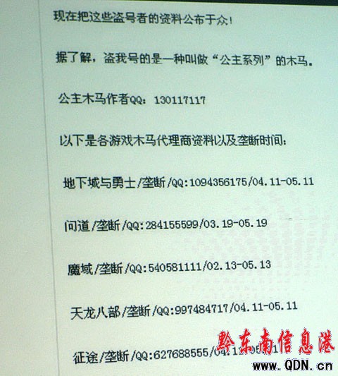 2009年4月,黔東南州三穗縣公安局網絡安全監察大隊在瀏覽某論壇時,發現多人在論壇中提到以下內容:多人瀏覽過某色情網站、他們都下載并安裝過色情網站指定的播放器、瀏覽者都是某一種或多種游戲的玩家、瀏覽者的游戲裝備被偷并在某處叫賣等等。并有多名受害者通過長時間上網觀察后得出并公布盜取游戲裝備者的網名為“公主”的QQ號。