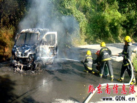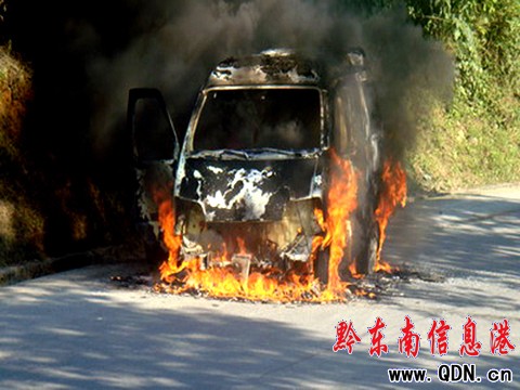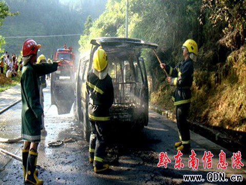 本港訊 (特約記者 張正特)7月11日傍晚,一輛面包車行駛至榕江縣五里橋加油站附近路段時突燃大火。事發后,當地7名消防官兵迅速前往處置,很快將大火撲滅,但面包車已被燒成“光架架”。事故未造成車上人員傷亡。