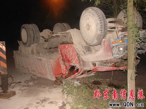 本港訊 (通訊員 蔣偉 攝影報道)2009年9月24日凌晨1時50分,凱里市二龍至三棵樹鎮方向氧化鋁廠內發生一起交通事故,一輛卡車翻下路坎“四腳朝天”,司機被困駕駛室內。經凱里市消防二中隊積極救援,2時35分,被困司機被救出,并無生命危險。