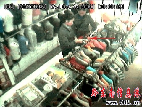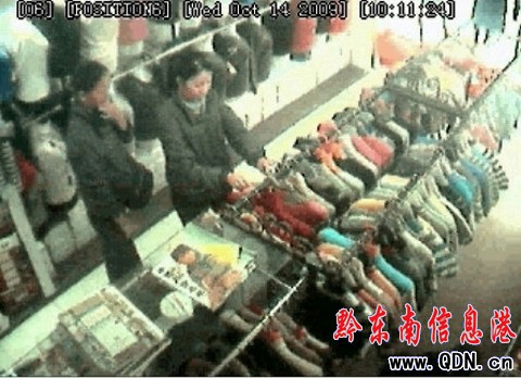 據該店店主介紹,13日,他家在中博商貿區經營的毛線、毛衣店丟失了一件價值800余元的羊絨毛衣,由于當日未開啟監控,不知何人所竊。14日,店鋪一開門便開啟了監控。不料,當日上午,趁店員不備時,兩名約30余歲的女子進了店(見圖),在3分鐘時間內,佯裝挑選毛衣時竊走了店中至少4至5件羊絨毛衣;2人返出店外后又很快進店,再次竊走了1件羊絨毛衣。“這幾件毛衣光進價都超過4000,幾分鐘后我們調出監控錄像才知被這兩人竊走。”店家說,兩女子行竊時動作很“麻利”,把毛衣連同衣架一道快速塞進“肚皮中”(見圖),出門時像兩個孕婦。記者從監控錄像上看到,這兩女子從店中至少“順手牽羊”擄走了6件毛衣。