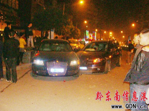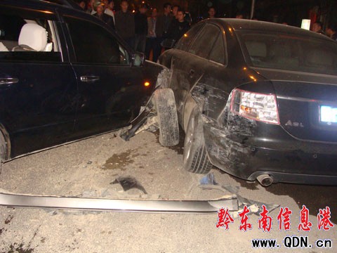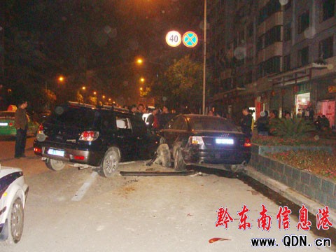 事發(fā)后記者聞訊后于23日凌晨0時23分趕到了現(xiàn)場。這時,幾名民警將醉漢請上了警車,然后駛離了現(xiàn)場往醫(yī)院而去。記者看到,醉漢駕駛的三菱車還停放在路面上,車頭朝著凱里萬博方向,右前輪已經(jīng)脫落,在地面上“躺”著。此外,車輛左前門也受到了重創(chuàng),平整的門塊由此變得坑坑洼洼。