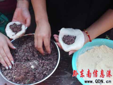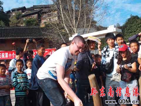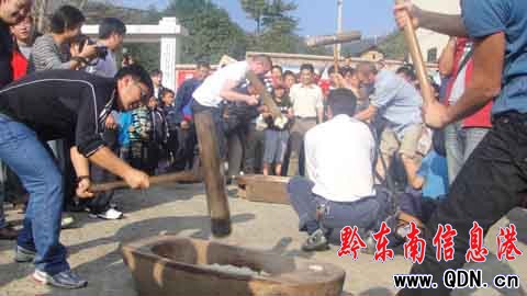 打糍粑是當天最熱鬧的一個環節,主人拿出事先準備好的糯米,讓客人親自動手,感受一下氣氛。當把一大桶蒸熟的糯米倒入木槽中,就連前來游玩的外國友人也忍不住錘上幾錘。大家一起努力打完這塊被千錘百煉得很軟很黏的糍粑,就開始品嘗了。掰下一小塊,再蘸上一些用芝麻粉做成的黑色調料,嘗一嘗,味道還不錯啊!大家對又燙又香又粘手的苗家糍粑贊不絕口。