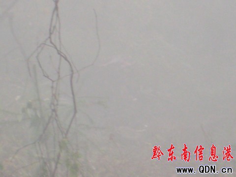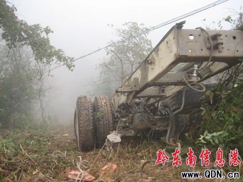 12月2日,記者路經事故現場。當天的霧很大,10余人在大霧中努力作業著。記者看見,大卡的貨箱和車頭已經分離,貨箱已被吊出,工作人員正在吊貨箱支架,在100余米深的樹林下面,大霧中車頭隱隱可見。