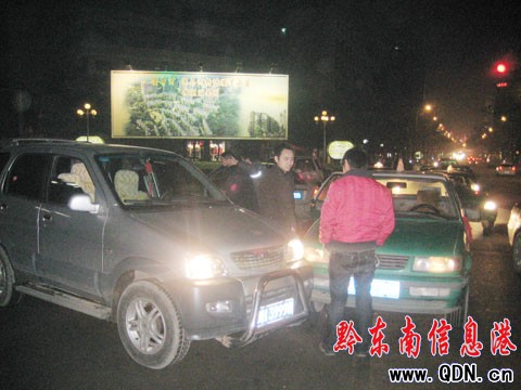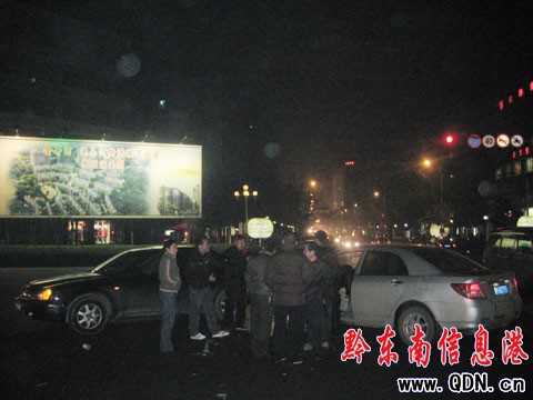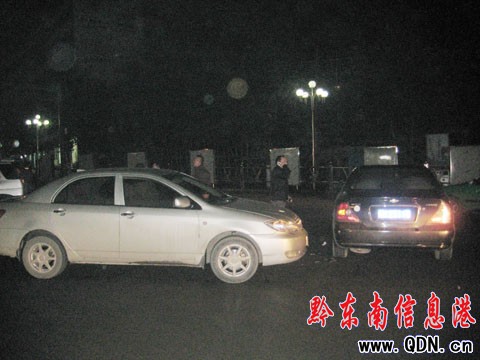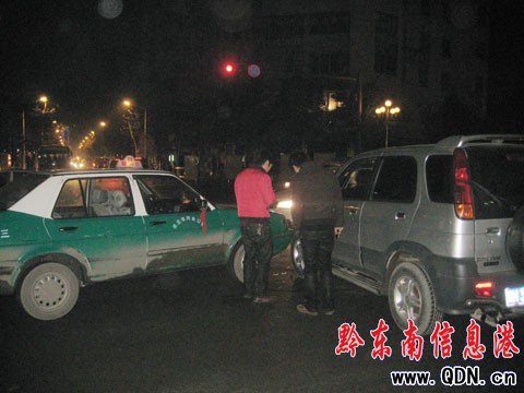 本港訊 (記者 楊驥 攝影報道)1月24日晚20時許,凱里韶山南路與金井路交叉口發生交通事故,一輛黑色雪弗蘭與一輛銀色比亞迪在此相撞,比亞迪的保險杠被撞壞。事發后雙方車主商議賠償問題,但直到20時20分許仍沒有達成協議。就在這時,一輛的士與一輛小型越野車比亞迪身后10米處相撞,所幸無人在這兩起“對對碰”中受傷。