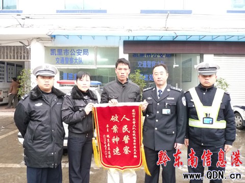 本港訊 (熊金風 記者 許世芳 攝影報道)近日,凱里市交警大隊民警為車主吳連華追回被盜摩托車,挽回經濟損失6280元,失主特給凱里交警送來一面錦旗,以示自己的感謝。