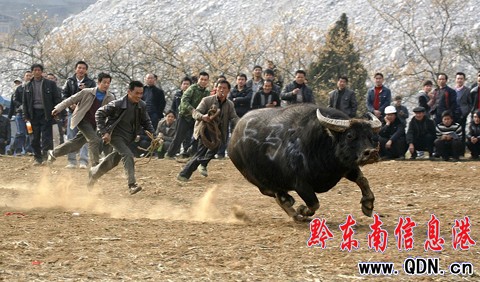 春節期間,黔東南州各村各寨幾乎都要舉行斗牛賽事,以此來迎接春天的到來。黔東南的斗牛文化可上溯到5000年以前,人們愛斗牛,以水牛相斗,并不是戲牛取樂,而是以斗牛的方式,展示當地各民族敬牛愛牛崇拜牛的特性。