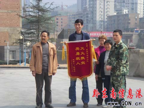 獲救小伙帶錦旗感謝凱里消防官兵