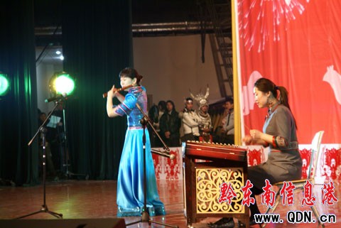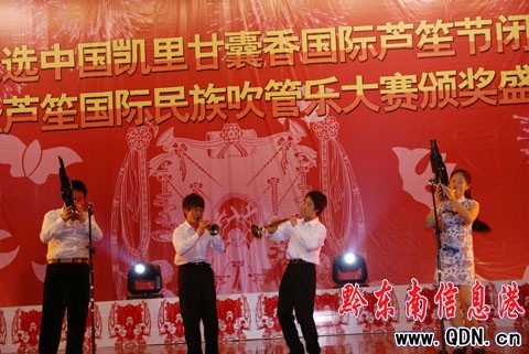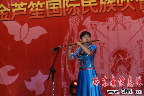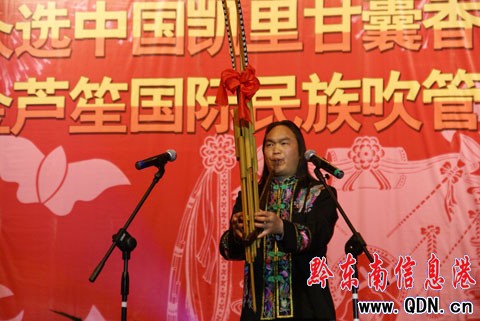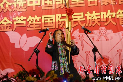 本港訊 (記者 楊驥 攝影報道)3月5日,2010中國·凱里甘囊香國際蘆笙節(jié)“金蘆笙”首屆國際民族吹管樂大賽決賽階段比賽在行政中心舉行,最終,丹寨選手楊正平奪得了蘆笙組冠軍,楊帆奪得吹管氣鳴組冠軍,王琦等四人奪得簧管組冠軍,王榮則在哨嘴氣鳴組稱雄。至此,“金蘆笙”首屆國際民族吹管樂大賽全部結(jié)束。