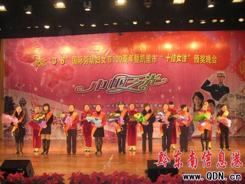 本港訊 (記者 楊驥 攝影報道)3月8日晚,凱里市慶祝“三八”國際勞動婦女節(jié)100周年文藝晚會暨凱里市“十佳”女性頒獎晚會行政中心中央會場的演播大廳內(nèi)隆重舉行,為榮獲凱里市“十佳”女性的李碧琴、肖金云等頒獎。