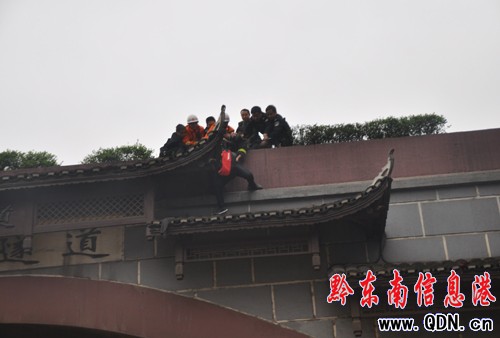 本港訊 (記者 廖強 攝影報道)3月23日上午8時30分左右,安徽一男子攀爬到凱里大閣山隧道口頂部的瓦閣上,揚言要跳到十幾米高的地面上去。40多分鐘后,該男子“走神”,負責施救的消防官兵和民警乘機出手,一把伸手將其抓住,并拽回了地面。