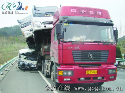 據(jù)金黔在線 昨日上午11時(shí)許,一輛由玉屏往貴陽方向行駛的安徽籍大型半掛牽引車,行駛至滬昆高速公路1694Km處時(shí),車上所載的5輛商品車突然墜落,砸在路上及護(hù)欄外,致使道路半幅交通受阻。