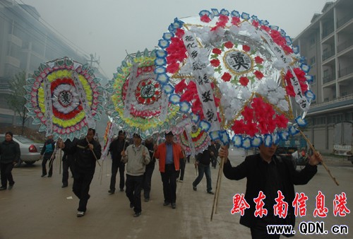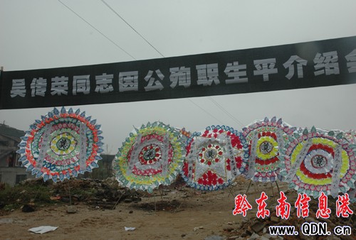 同時他還獨自一人完成全鄉林改圖文表8000多棕林地,面積達11萬畝。在德化鄉的苗村侗寨,大家都知道吳傳榮站長是一個工作狂。德化鄉岑已苗寨62歲的吳德才說:“我無法忘記吳傳榮一年四季都在山里轉的樣子:一個測繪儀和一包冷飯團是他的隨身物。”圖為人們向吳傳榮站長敬獻的花圈。