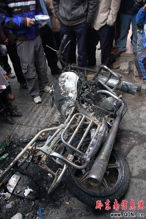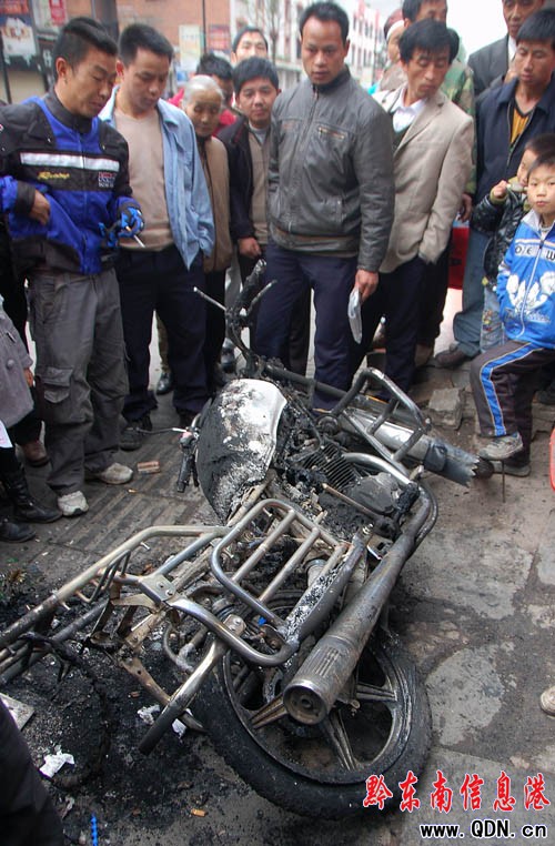 本港訊 (記者 楊驥 攝影報道)17日,在凱里步行街,市民們在圍觀一輛被火焚毀的摩托車。據車主稱,16日晚,他騎著此車行經此路段時,車子油箱下部突然竄起了火苗,見勢不妙,他急忙摞下摩托,端來水試圖澆滅……“僅僅幾分鐘,摩撫便燒成了光架架!