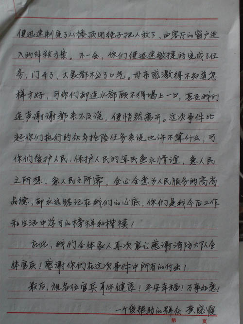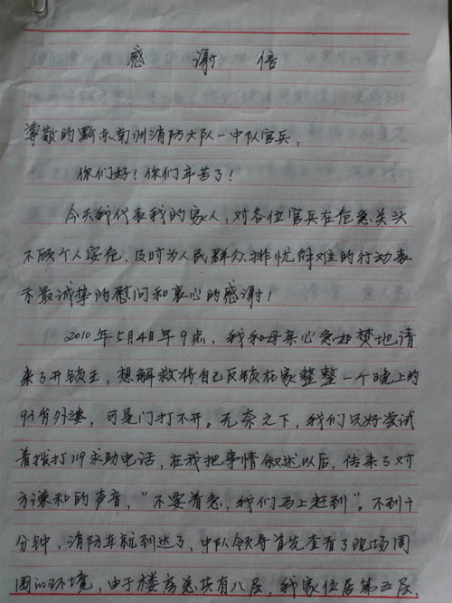 今日,黔東南信息港接到了黃女士發來的感謝信,黃女士希望通過信息港向凱里市消防大隊全體官兵表達自己的謝意,黃女士在信中說:“這次事件比起你們執行的眾多搶險任務來說也許不算什么,可你們愛護人民、保護人民的軍民魚水情意,全心全意為人民服務的高尚品德卻永遠銘記在我們心底,你們是我今后工作和生活學習的榜樣和楷模!”