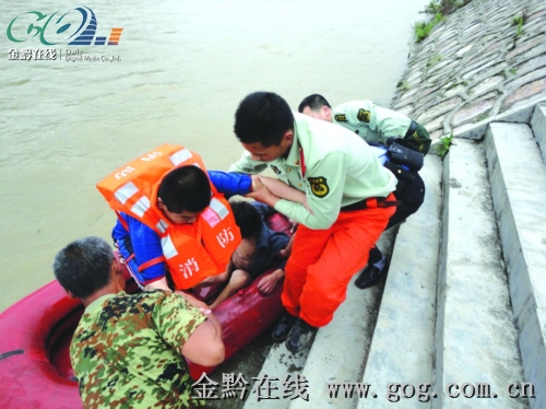 中午13時(shí)46分,施秉縣消防隊(duì)接到群眾報(bào)警后立即趕到事發(fā)現(xiàn)場(chǎng),一名官兵下水游至兩被困人員處,給他們穿上救生衣,同時(shí)派人到附近尋找橡皮艇救人。