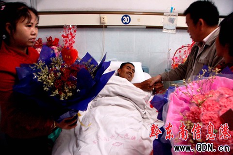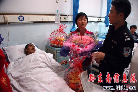 本港訊 (記者 李麗娟 攝影報道)凱里市53歲的農民趙珍雄在面對歹徒時臨危不懼,勇敢撲上前去,與歹徒博斗時不幸身負重傷,但僥幸撿回一命(本港曾做詳細報道)正當其家人因沒錢醫治準備出院時,20日,獲悉此事的當地黨委、政府有關負責人趕到醫院,表示將為趙珍雄“買單”,直至他完全康復出院。