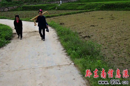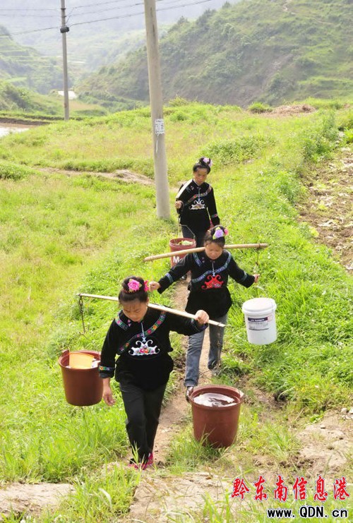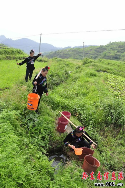 凱里市三棵樹鎮償朗村下寨婦女從2里多遠的山溝挑水回家的途中