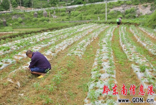 村民在凱里市三棵樹鎮償朗村稻田里給改種的辣椒苗進行管理