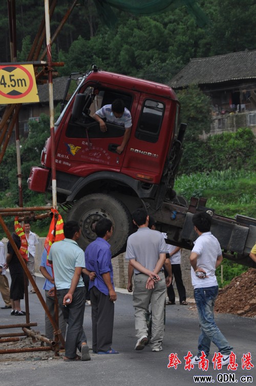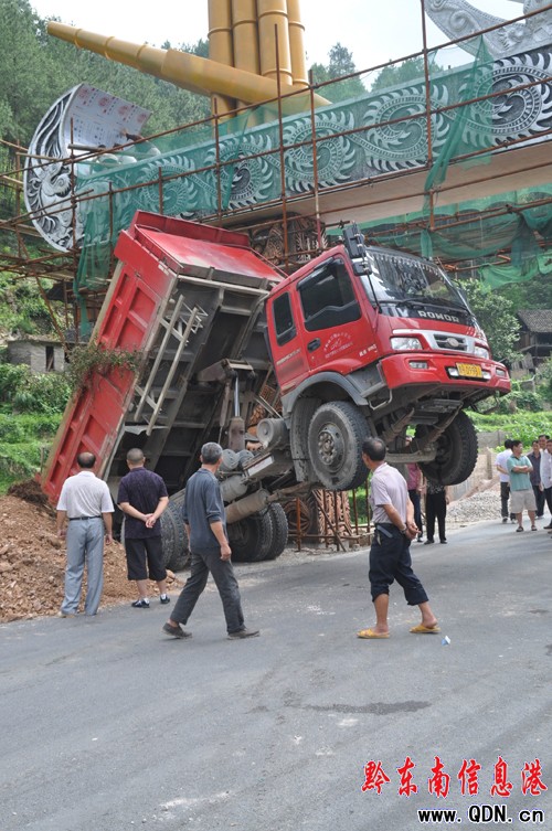 本港訊 (記者 劉仙 攝影報道)7月2日上午9時30分,一輛紅色大貨車在黎(平)爐(山)公路三棵樹鎮瓦寨路段的一建筑工地上傾倒土石方時車頭突然“翹”了起來,最后懸在了距離地面約1米高的半空中,駕駛員因此也被抬到了半空中,既下不了車,又無法迫使車頭降落在地面上,急得滿頭大汗。
