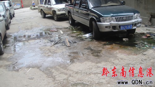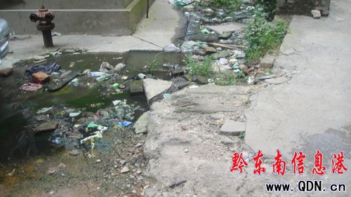 記者在該小區(qū)看到,糞水從小區(qū)路面的拐角處流出,一直滲透到路面上,并伴著許多隨糞水而來的生活垃圾,遠遠就聞到一股惡臭。
